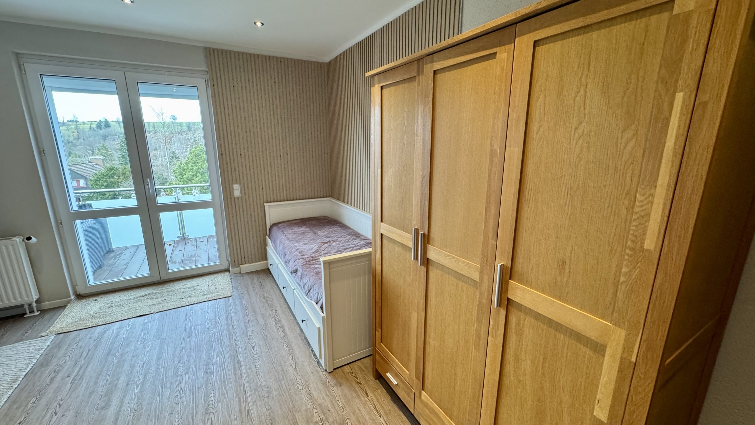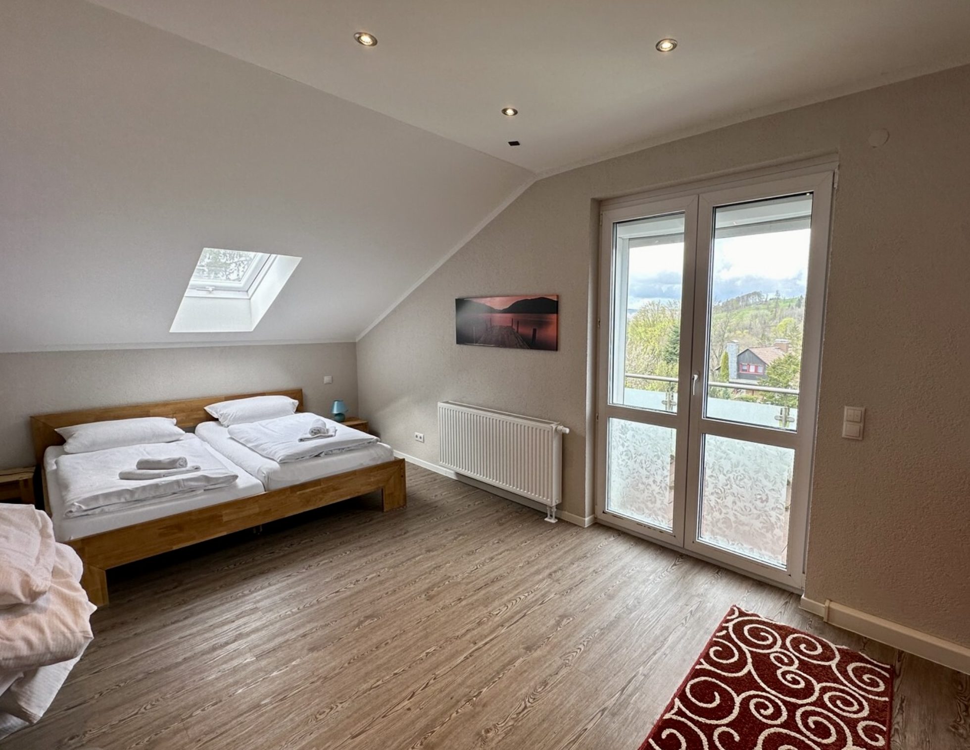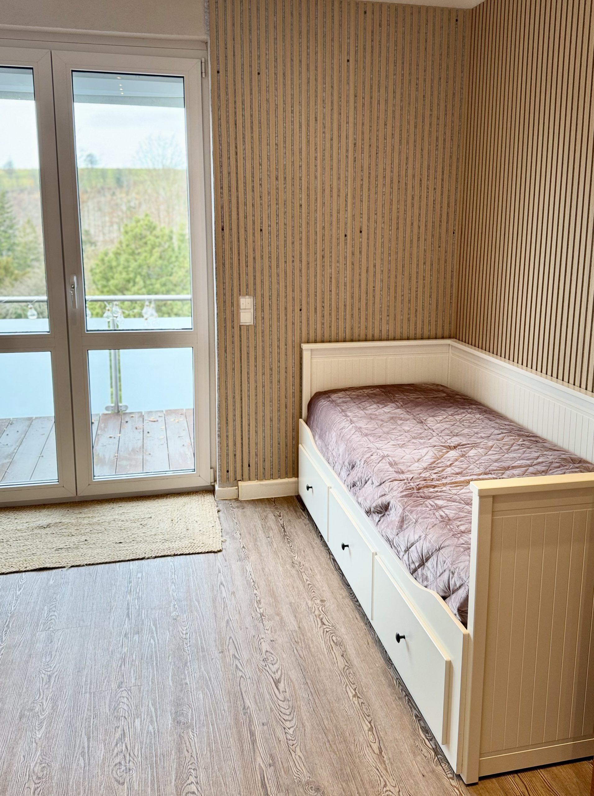 Großes Doppelbett, viel Platz sowie ein zusätzliches Tagesbett und Zugang zum Balkon mit Grill.