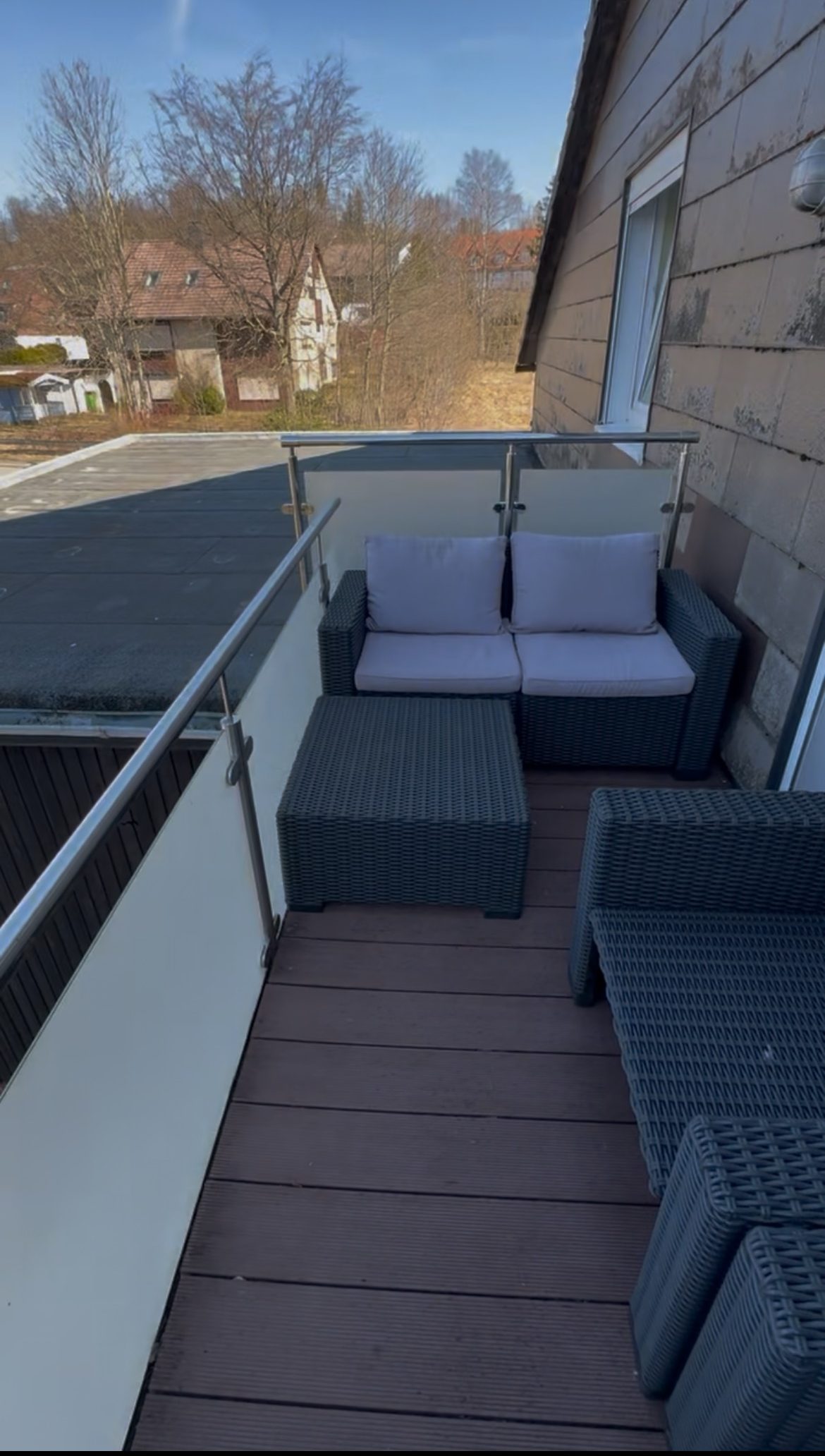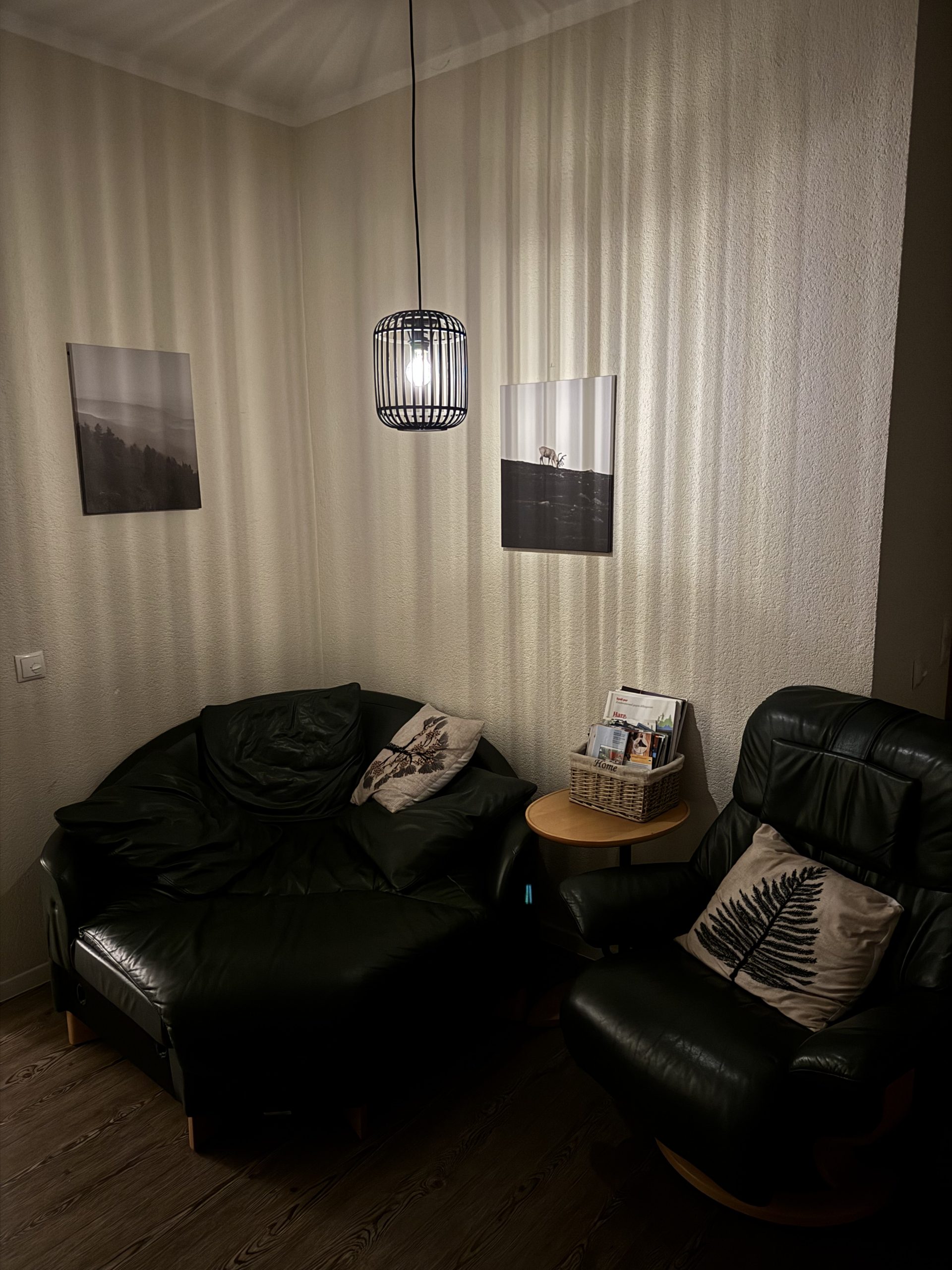 Viel Tageslicht und dazu ein großer Esstisch, gemütliche Chillout Area mit einem schönen Sofa. Außerdem TV & PS4